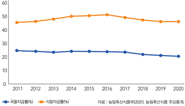 2020년 기준 우리나라의 식량자급률은 46% 수준이고, 사료 등을 포함한 곡물자급률은 20%를 간신히 넘긴 수준이다. 곡물의 대외의존도가 대단히 높은 것은 사실이지만 이러한 현상이 최근 벌어진 일은 아니다. 2011년 식량자급률이 50% 밑으로 떨어졌고, 그 이후 50% 수준에서 등락을 거듭하다 최근 3∼4%p 추가로 떨어졌다. 사료 등을 포함한 곡물자급률은 2003년 30% 밑으로 떨어진 후 이젠 20% 선이 위협을 받고는 있지만, 과거의 추세가 유지되는 것이지 급격하게 떨어진 것은 아니다. 코로나19의 영향으로 국제 곡물 수송에 차질이 발생해 곡물값이 오르고, 러시아가 곡창지역인 우크라이나를 침공해 또다시 곡물값이 오른 것은 사실이지만, 대외적인 영향에 의해 식량자급률이 낮아졌다고 볼 수는 없다.