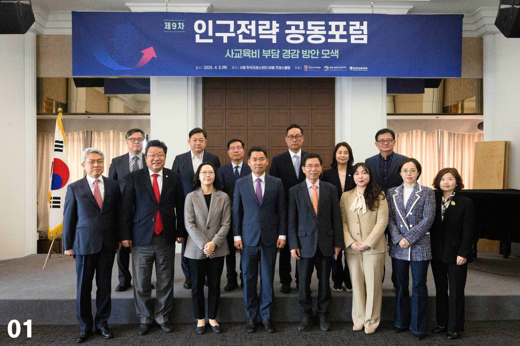 경제·인문사회연구회와 대통령직속 저출산고령사회위원회, 한국교육학회가 함께한 「제9차 인구전략 공동포럼: 사교육비 부담 경감 방안 모색」이 2025년 4월 3일(목) 한국프레스센터 20층 프레스클럽에서 개최되었다. 인구전략 공동포럼은 저출생의 원인이 되는 다양한 사회문제와 인구구조 변화가 초래할 미래 위기 등에 대해 다양한 의견수렴, 공론화, 대안 모색 등을 목표로 저출산고령사회위원회와 경제·인문사회연구회, 사회과학학회 간의 협업을 통해 2024년도에 이어 올해 2월부터 순차적으로 개최되고 있다. 이번 제9차 인구전략 공동포럼에서는 ‘사교육비 부담 경감 방안 모색’을 주제로, 개회식 후 제1세 션은 남궁지영 한국교육개발원 선임연구위원이 ‘저출생 위기 극복을 위한 사교육 정책 방안’을 주제로 발표하였고, 다음으로 김영철 서강대학교 경제학과 교수가 ‘저출생 위기 극복을 위한 대입제도 개편 방향’을 주제로 발제하였다. 이어서 제2세션에서는 강태훈 성신여자대학교 교육학과 교수(한국교육학회 상임이사)를 좌장으로, 학·연·민 등의 관계자들이 패널로 참여하여 종합토론을 진행하였다.