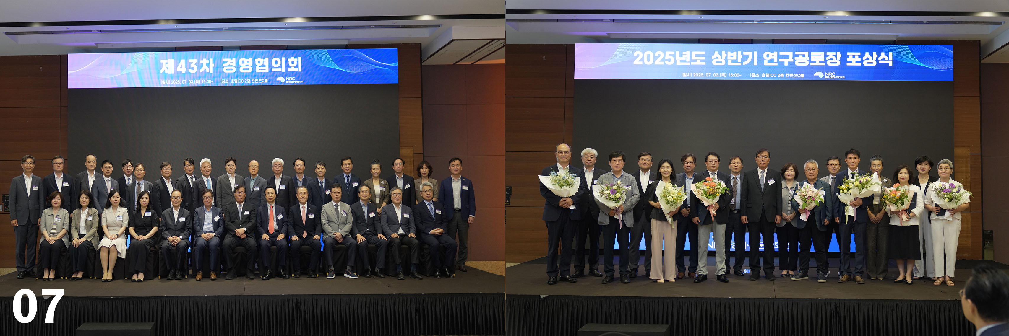 제43차 경영협의회에서는 2025년도 상반기 연구공로장 포상식을 시작으로 '연구회-연구기관 브라운 백 미팅 후속조치', '2025년도 국책연구기관 제도개선 추진계획', '국책연구기관 연구성과 홍보 강화 추진계획', '출연연 통합업무정보시스템(NFIS) 및 정책연구 AI 소개' 등 연구회 및 연구기관 주요 현안에 대해 논의하였다. 연구공로장 포상은 국가 R&D분야에서 국가발전에 기여한 연구회 및 연구기관 재직자들의 사기진작 및 우수인력의 지속적인 확보를 위하여 매년 정년 퇴직자를 대상으로 실시하는 포상으로 이번 2025년도 상반기 연구공로장 포상은 총 12개 연구기관 24명이 수상하였다.